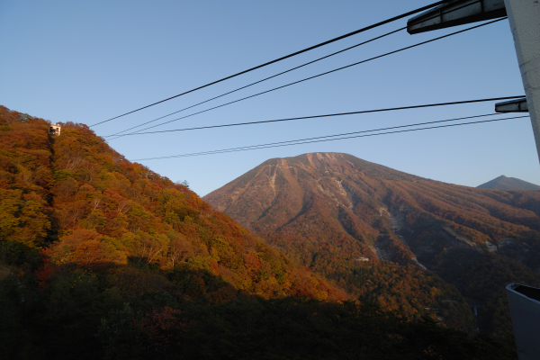 明智平パノラマレストハウスから頂上駅と男体山(2486m)。後ろは大真名子山(おおまなごさん・2375m)